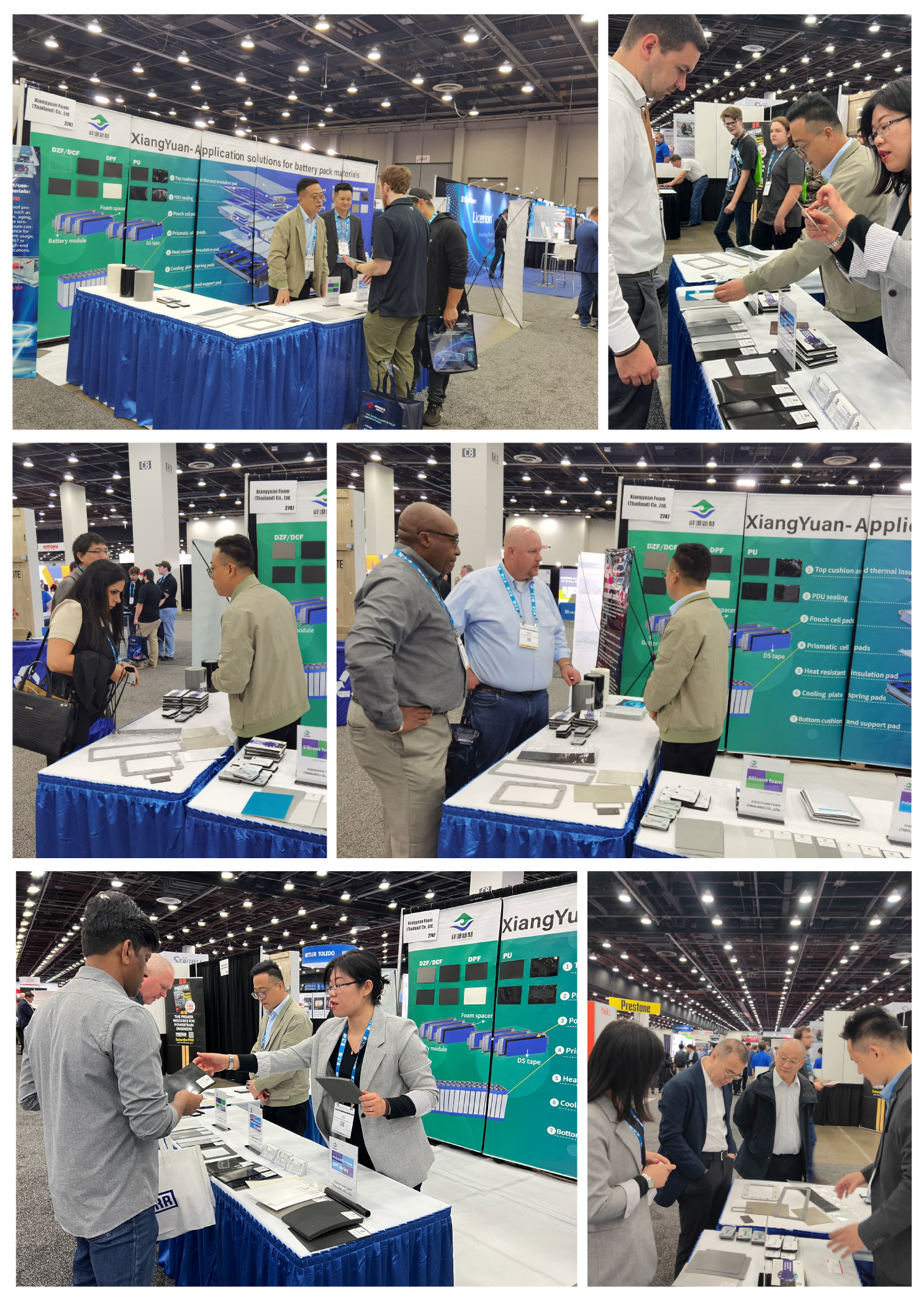 祥源國際貿(mào)易部精英們遠赴美國,攜帶聚烯烴、聚氨酯、有機硅膠等發(fā)泡材料,以及動力/儲能電池內(nèi)外密封、隔熱、支撐、緩沖、保溫、阻燃、防火、熱失控防護等材料亮相展會現(xiàn)場。